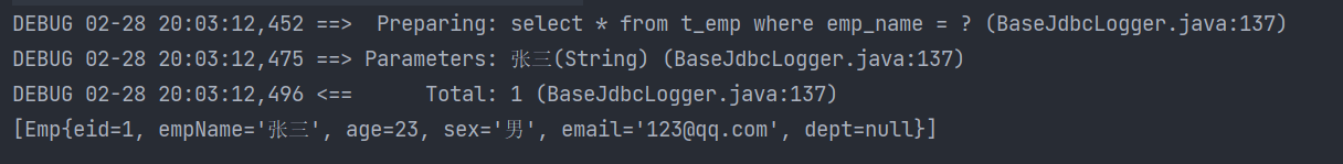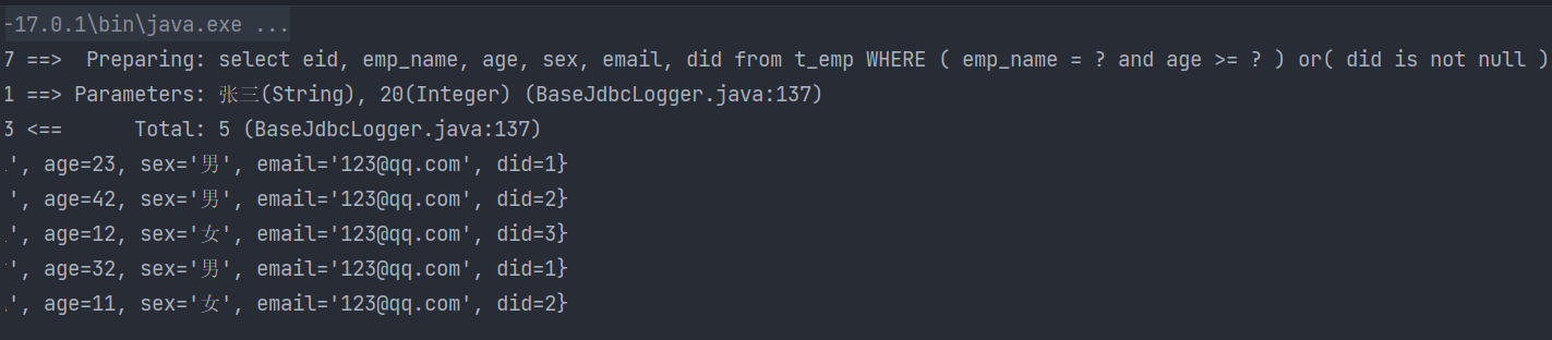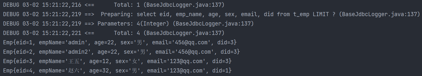 Page{count=true, pageNum=1, pageSize=4, startRow=0, endRow=4, total=8, pages=2, reasonable=false, pageSizeZero=false}[Emp{eid=1, empName='admin', age=22, sex='男', email='456@qq.com', did=3}, Emp{eid=2, empName='admin2', age=22, sex='男', email='456@qq.com', did=3}, Emp{eid=3, empName='王五', age=12, sex='女', email='123@qq.com', did=3}, Emp{eid=4, empName='赵六', age=32, sex='男', email='123@qq.com', did=1}]